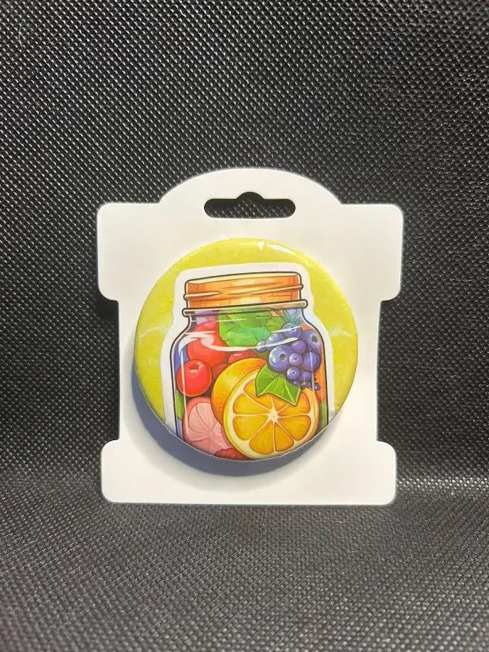 Handmade pin-back button that measures 2 inches in diameter - my hand is in the photos for size reference. The pin is created by coloring the background circle, placing a sticker on, and turning it into the pin-back button with my machine. This button is one of one, meaning it is unique and only this one exists of it. You will be receiving the exact button pictured.