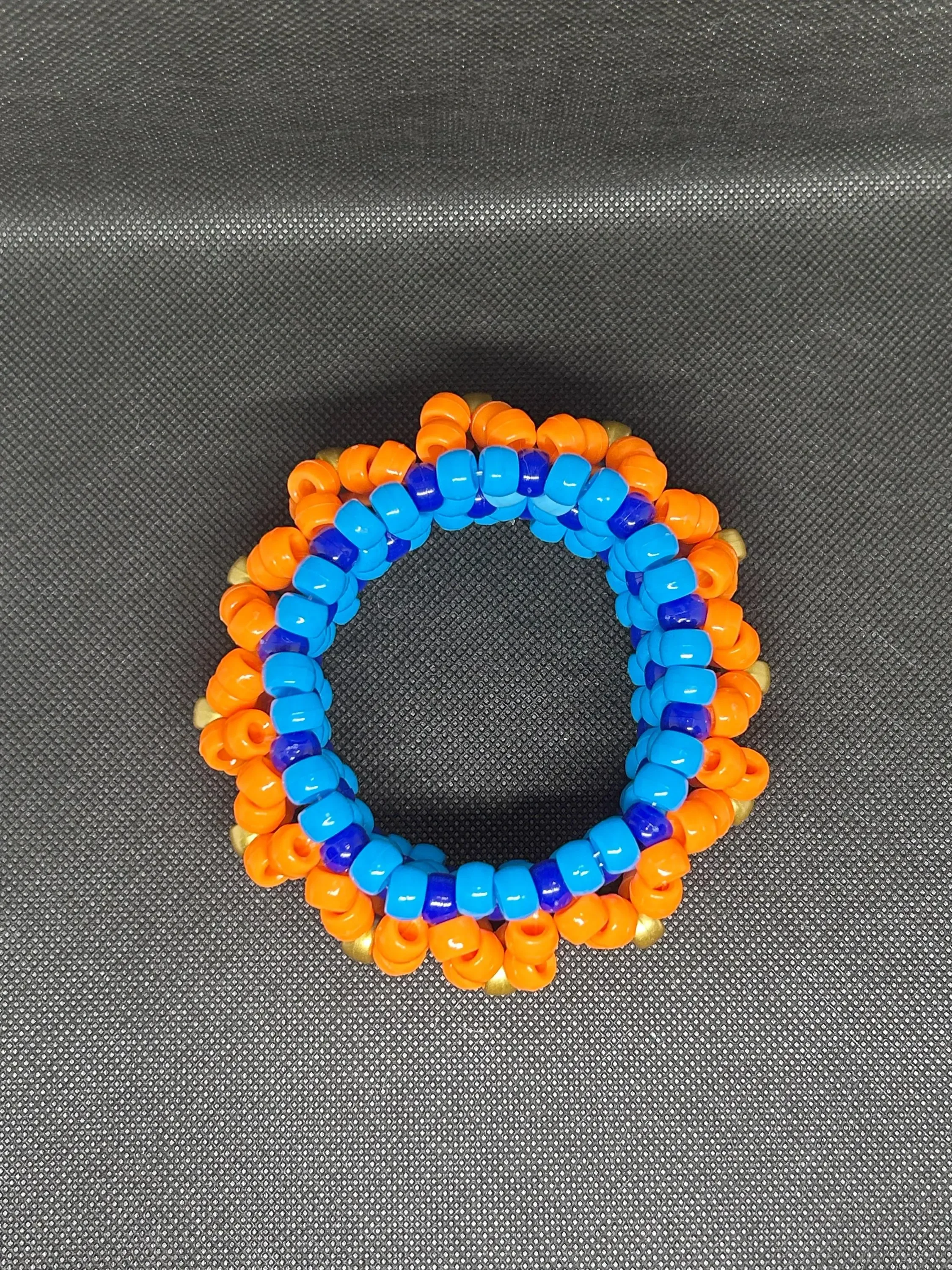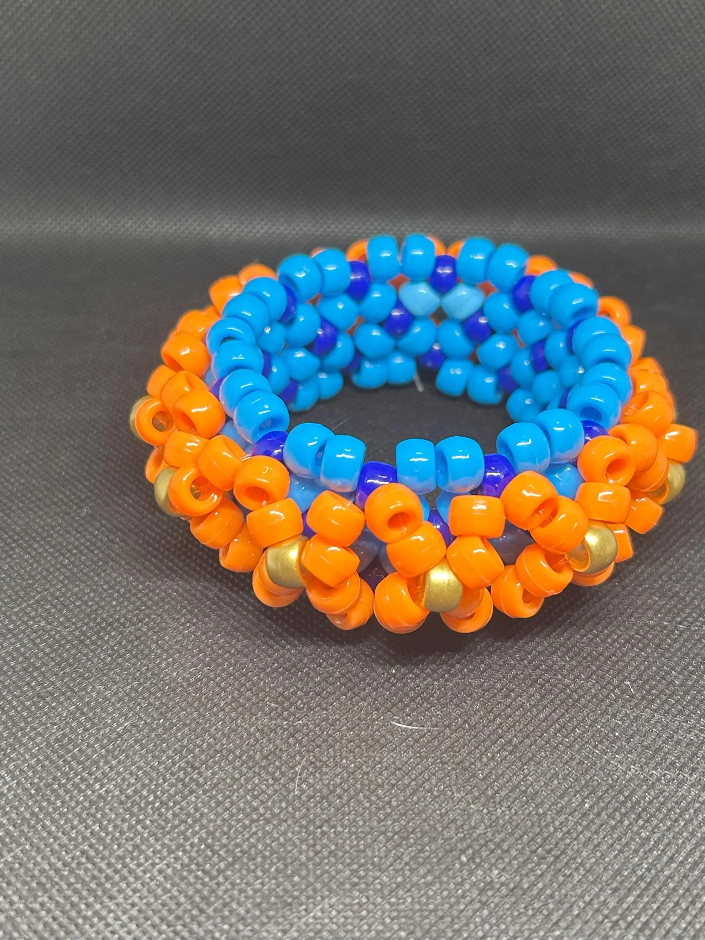 Handmade beaded kandi cuff bracelet featuring orange and black flowers. This cuff is made with stretchy elastic string so one size fits most. The knots are sealed with super glue, so it shouldn’t break.