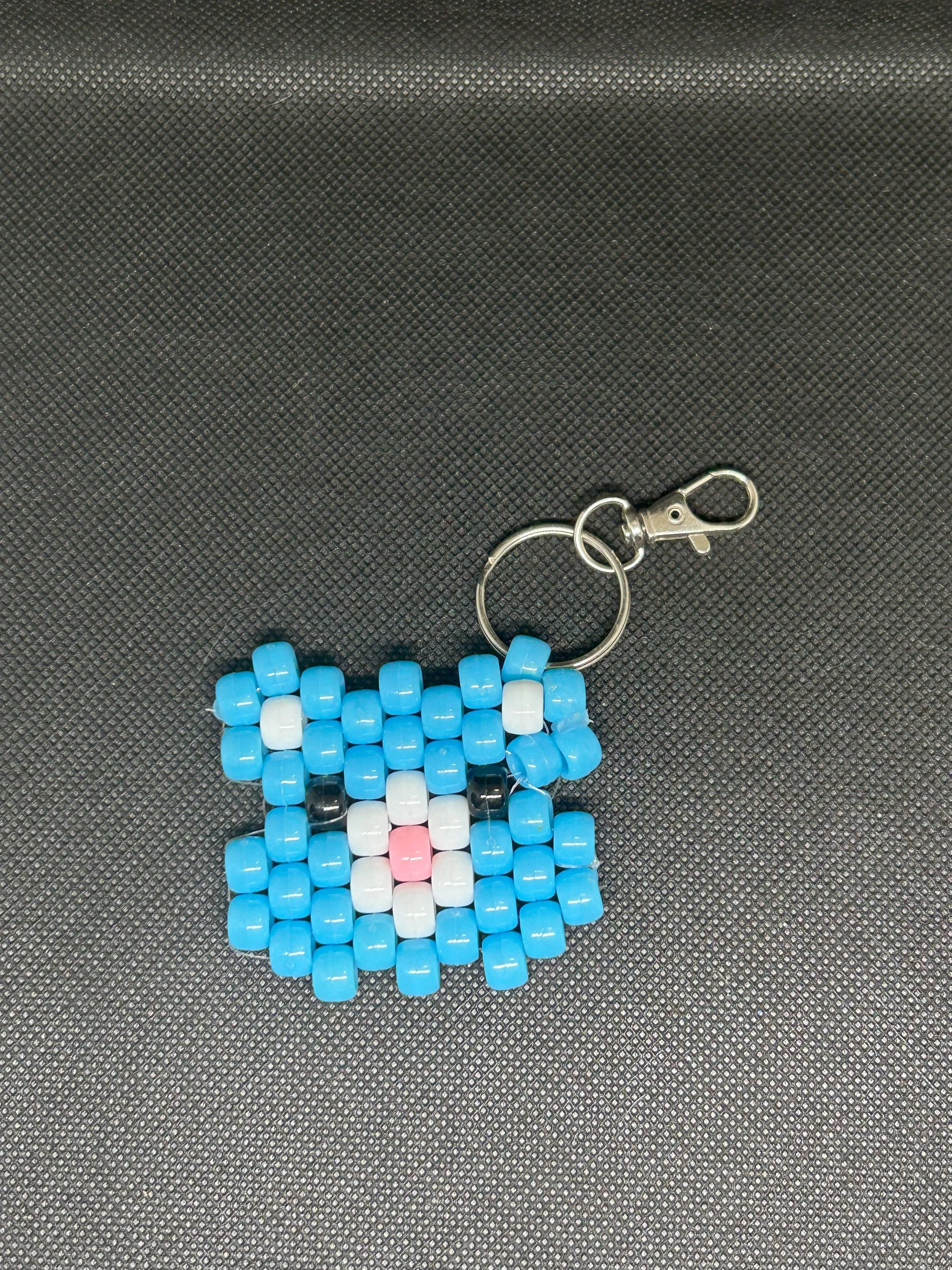 Handmade beaded kandi charm in the shape of a Quick Ball from the popular anime and TCG, Pokémon. It is attached to a keyring with a lobster clasp, so it can be used as a keychain or it can be clipped to a backpack zipper or loop.