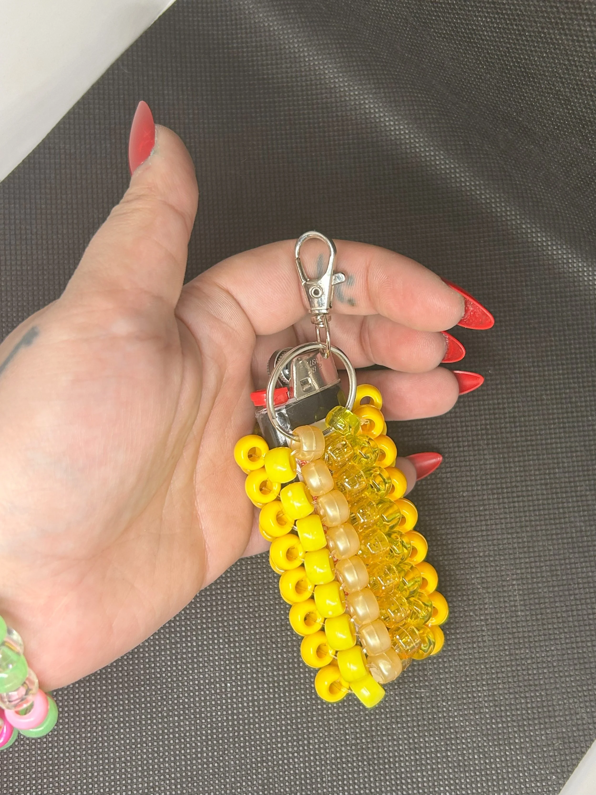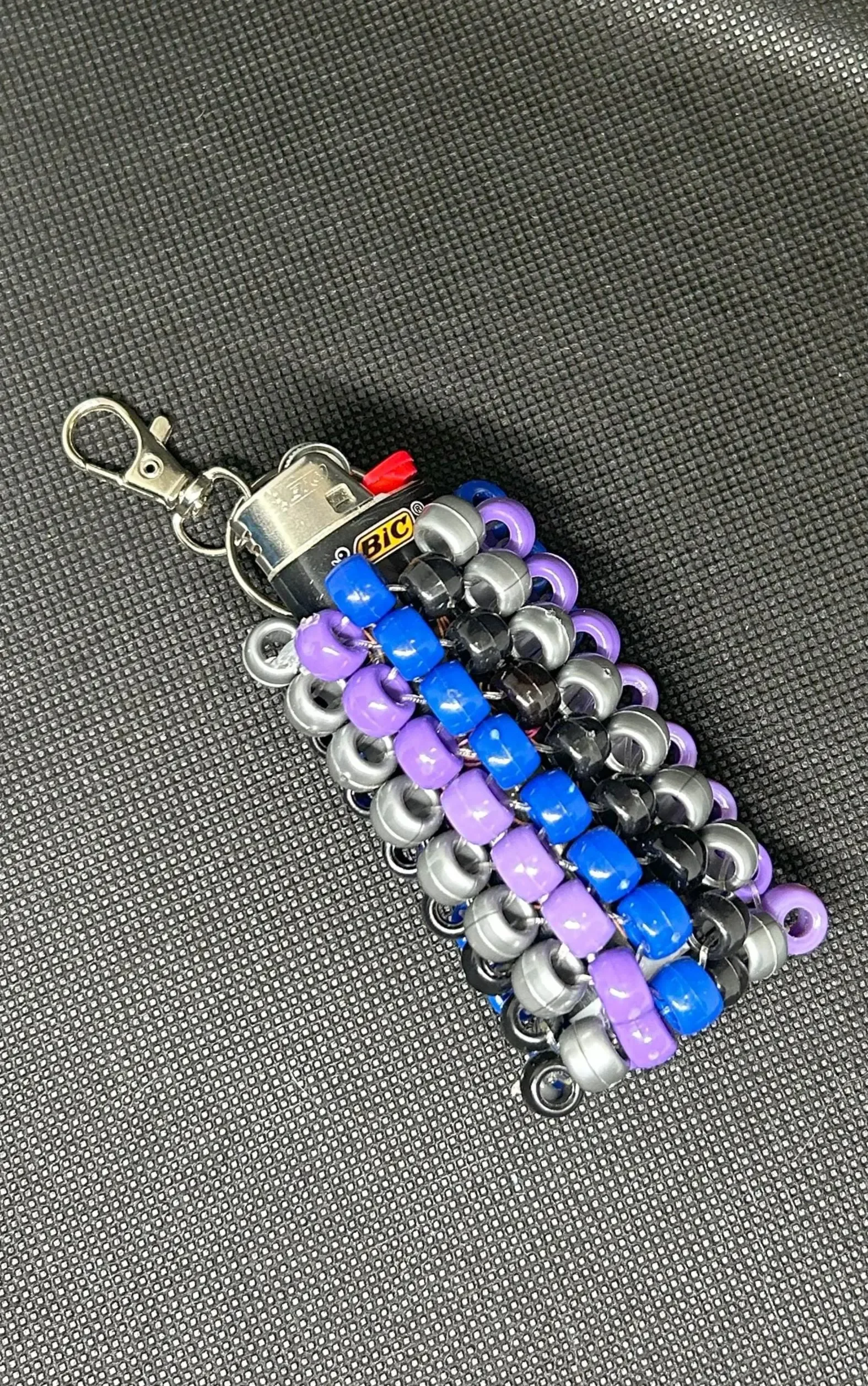 Handmade kandi lighter case with a tiger’s eye inspired color palette - orange, gold, brown, and black. Made with pony beads, strung together with stretchy elastic string, and knots are hot glued so they won't break. The cozy case is attached to a keyring with a lobster clasp so you can attach it to any backpack, bag, belt, etc. These cases fit any classic BIC or Clipper lighter.